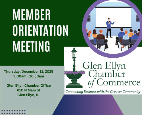 Please join us for our Chamber Member Orientation on Thursday, Dec 11th at 9:00am at the Glen Ellyn Chamber office.